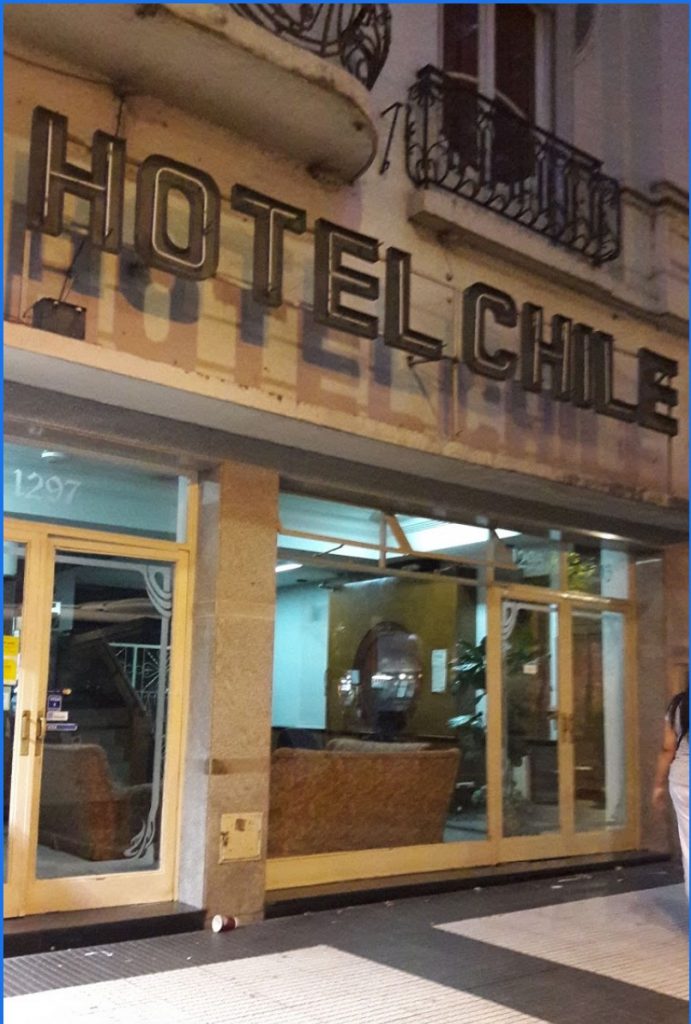 Kyllästyin hakemiseen. Hienoa hotellia vastapäätä näkyi kyltti Hotel Chile. Ajattelin, että nyt menen sisään vaikka väkisin. Sanoin rempseästi ovella, että olen Pauli Finlandiasta ja minulla on Chile-hattu päässä. Tarvitsen huoneen. Ukkoa nauratti, koska lakissani todella lukee Chile. Olisin kyllä päässyt sisään muutenkin, sillä tämä oli tällainen halpa hotelli, ei surkea, mutta halpa. No, mitäpä tuosta, säästyvät rahat seuraavaan matkaan.