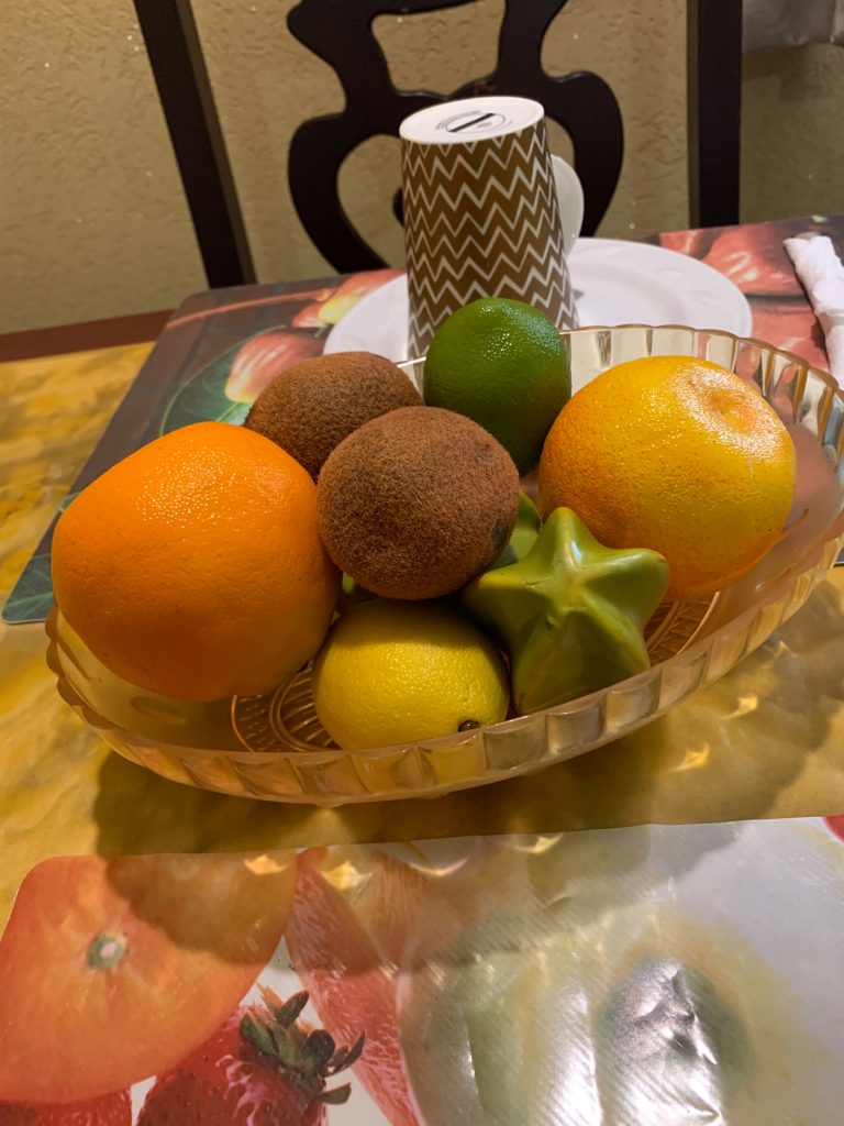 Aamupala täällä alkaa arkenakin klo 8. Se kertoo paljon myös työelämästä. Tulin juuri siltä. Mielenkiintoista, että joka pöydässä on hedelmäkori, mutta niitä ei kuitenkaan liene tarkoitus syödä, koska hedelmät tarjoillaan pöytään valmiiksi paloiteltuna.