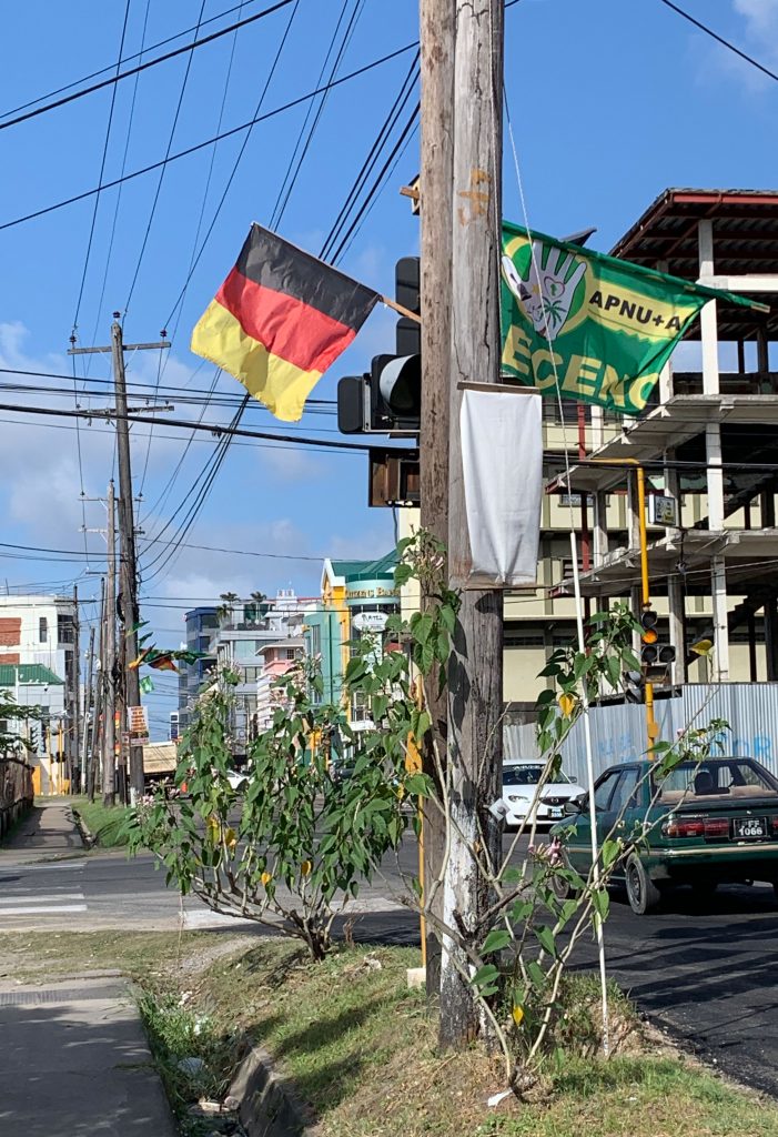 Tämähän on ollut itsenäinen vuodesta 1966. Maa oli aiemmin Guiana ja Brittiläinen Guiana brittihallinnon aikana. Ilmankos minulla on mennyt yyt, aat ja iit sekaisin maiden nimissä. Asia alkoi vaivaamaan rantaan tultua, koska tullimuodollisuudet olivat tarkat. Ensin laitettiin kahteen jonoon: kaikki guianalaiset ja muut. Passikontrolleja oli kaksi. Mitään viisumimaksuja ei ollut, pieni reppu pengottiin pintapuolisesti ja sitten tilataksiin, jonne mahtui 18 matkalaista kun tavaratilaa oli vähemmän kuin Surinamen puolella.