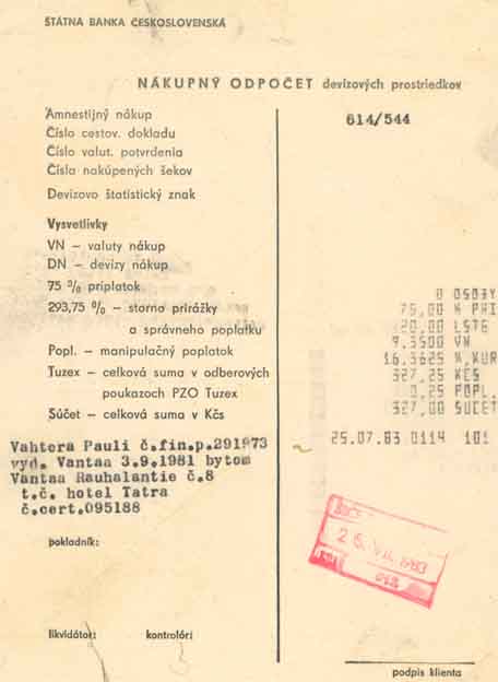 Aamulla piti mennä kahdeksaksi tytön luokse vaihtoa miettimään (vaihtotupa auki 8-10). Soittokierroksen tulos – Tvrdošín´ssa (kuulimme Tverdosini) voi vaihtaa; ajo sinne ja hotellissa vaihdettiin 30 dollaria ja samalla tyhjennettiin koko paikan kassa korunoista. Kauppaan syöksyttiin makkaranostoon, 50,60 korunaa meni (noin 25 mk) ja sillä saatiin pullo viiniä, 5 jättinakkia (=lenkkiä), salamia, vaniljakeksipaketti, parit limut, tulitikkuja. Lähikauppa löydettiin vanhasta, punaisesta parakista. 5 pullaa, 7 sämpylää ja pitkä valkoinen leipä + 5 kananmunaa maksoivat 14 korunaa eli 7 markkaa. Retkeilyalueella paikalliset pultsarit pitävät kestonuotiota; pystyssä oleva puu kaadetaan kaljan voimalla ja lämpöä riittää. Pauli käy keittämässä makaronit näiden nuotiolla ja makkaratkin paistuvat siellä. Illalla ajettiin ympäristössä – naposteltavaa ei löytynyt ja tivolikin oli kiinni.